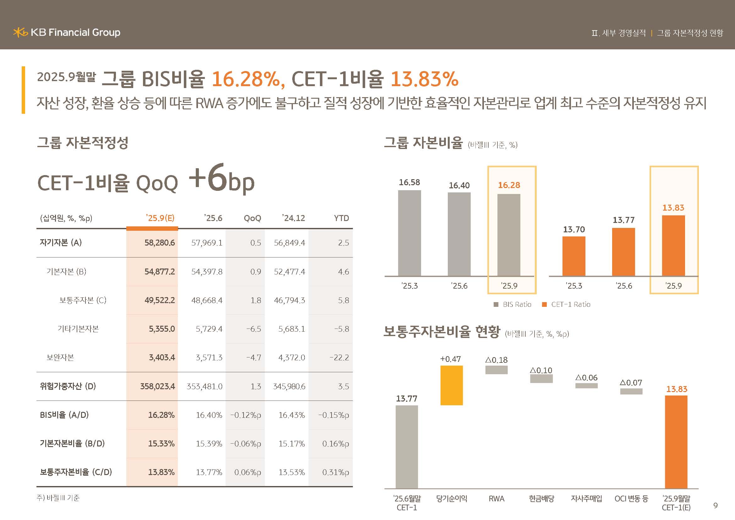 2025년 9월말 잠정치 기준 그룹의 BIS 비율은 16.28%, CET1 비율은 13.83%를 기록하며 업계 최고 수준의