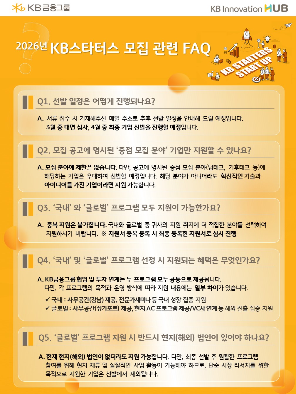 2. 귀사가 지원시 입력하신 정보는 ‘2026 KB스타터스(국내/글로벌)’ 선정을 위한 KB금융그룹 내 심사 자료로 활용되며, 미선발 기업의 정보는 선정 종료 시점에 일괄 폐기됩니다.