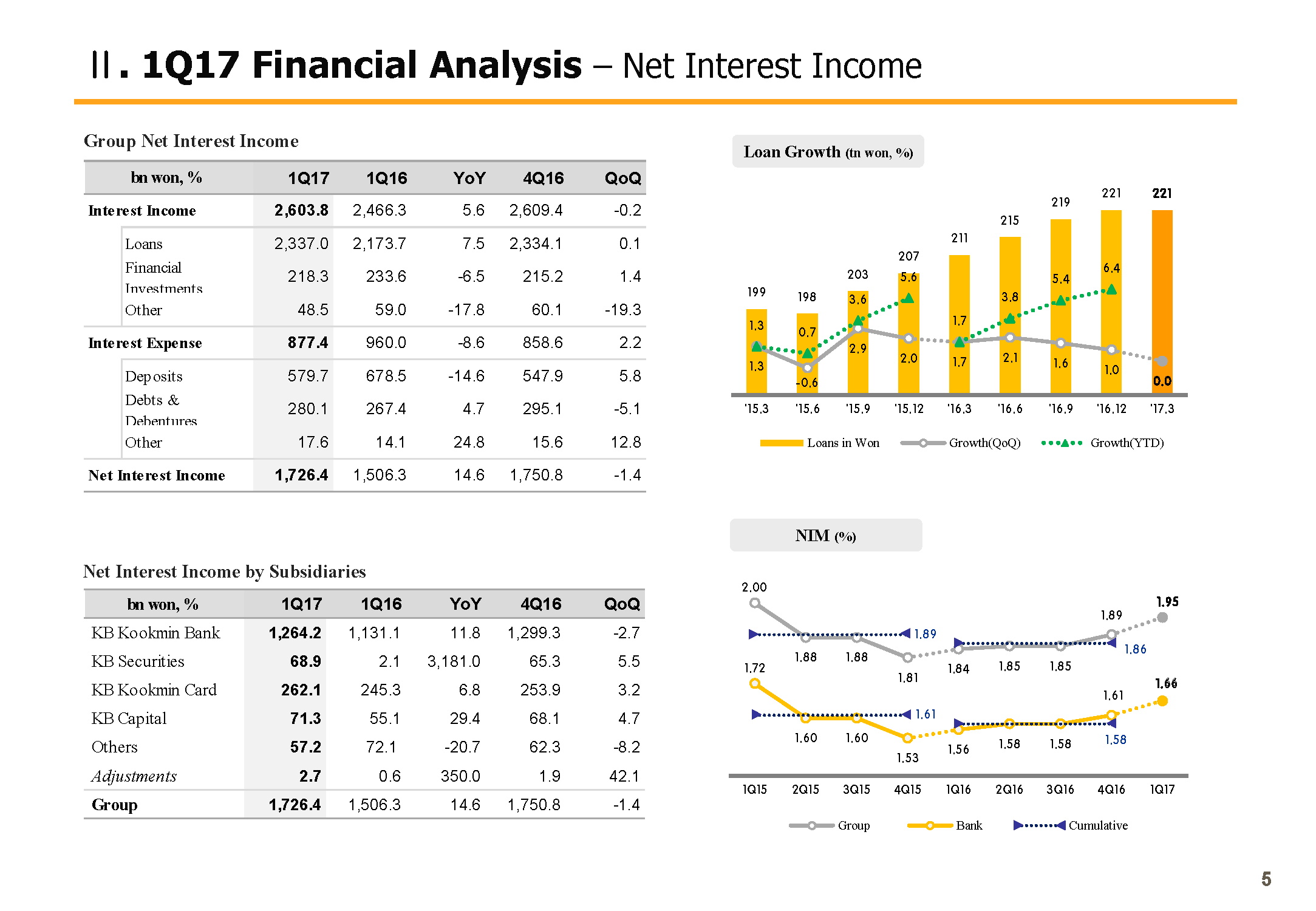 Looking at the line item, Q1 net interest income was KRW 1,726.4 billion. Underpinned by asset growth and better margin, the growth was 14.6% year-over-year. On a Q-on-Q basis, despite NIM growth, net interest income fell 1.4%. The reason for the decline is higher interest expense for the principal preservation trust from fluctuations in market rate and its overall slow asset growth and less absolute number of days.