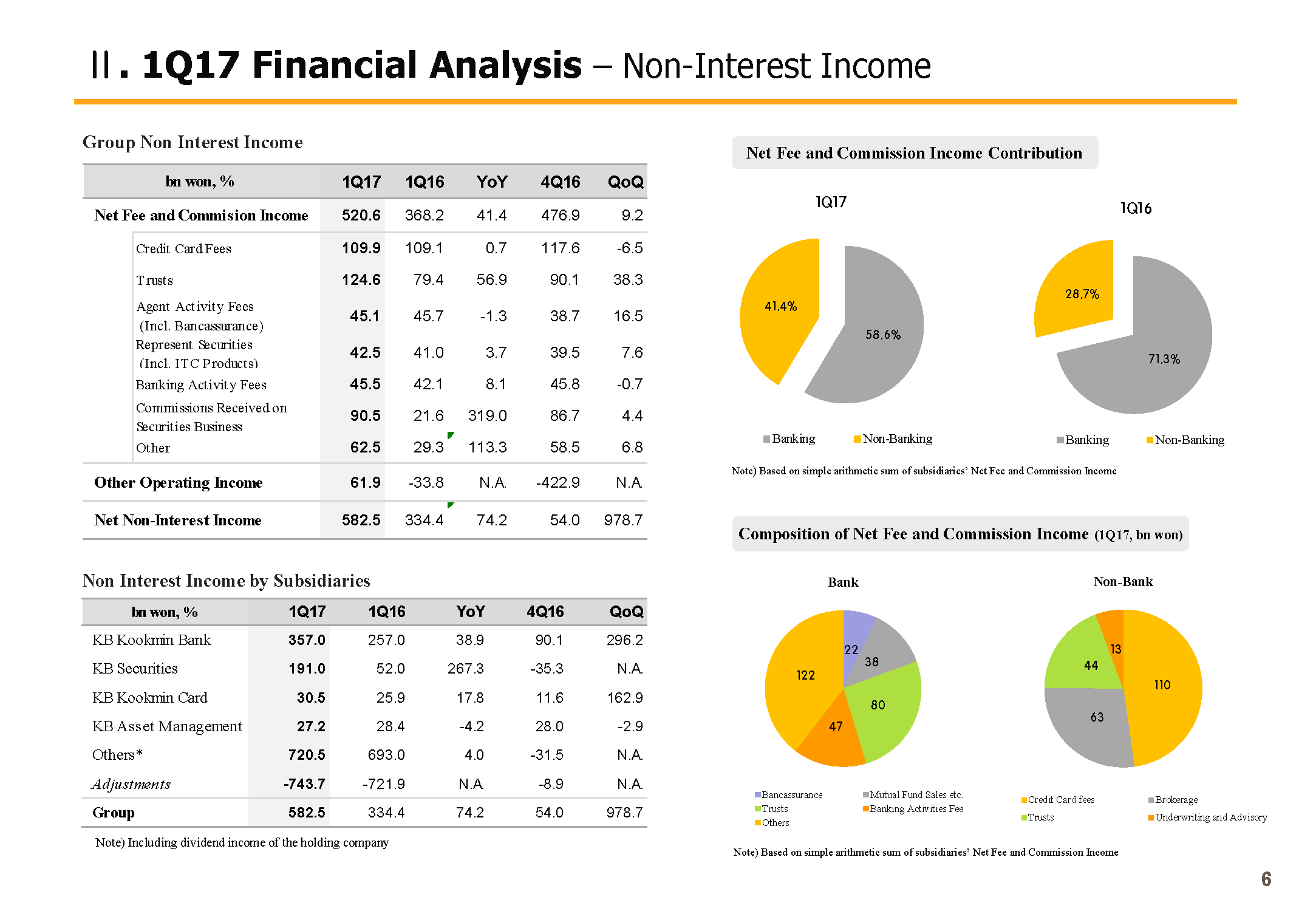 Q1 net fees and commissions income was KRW 520.6 billion, up 41.4% year-over-year on consolidation effect of Hyundai Securities among others. On a Q-on-Q basis, the growth was 9.2%, mostly on higher ELS sales from the bank, which led to higher trust fees, as well as overall improvement in fees and commissions from fund, Bancassurance and brokerage services.