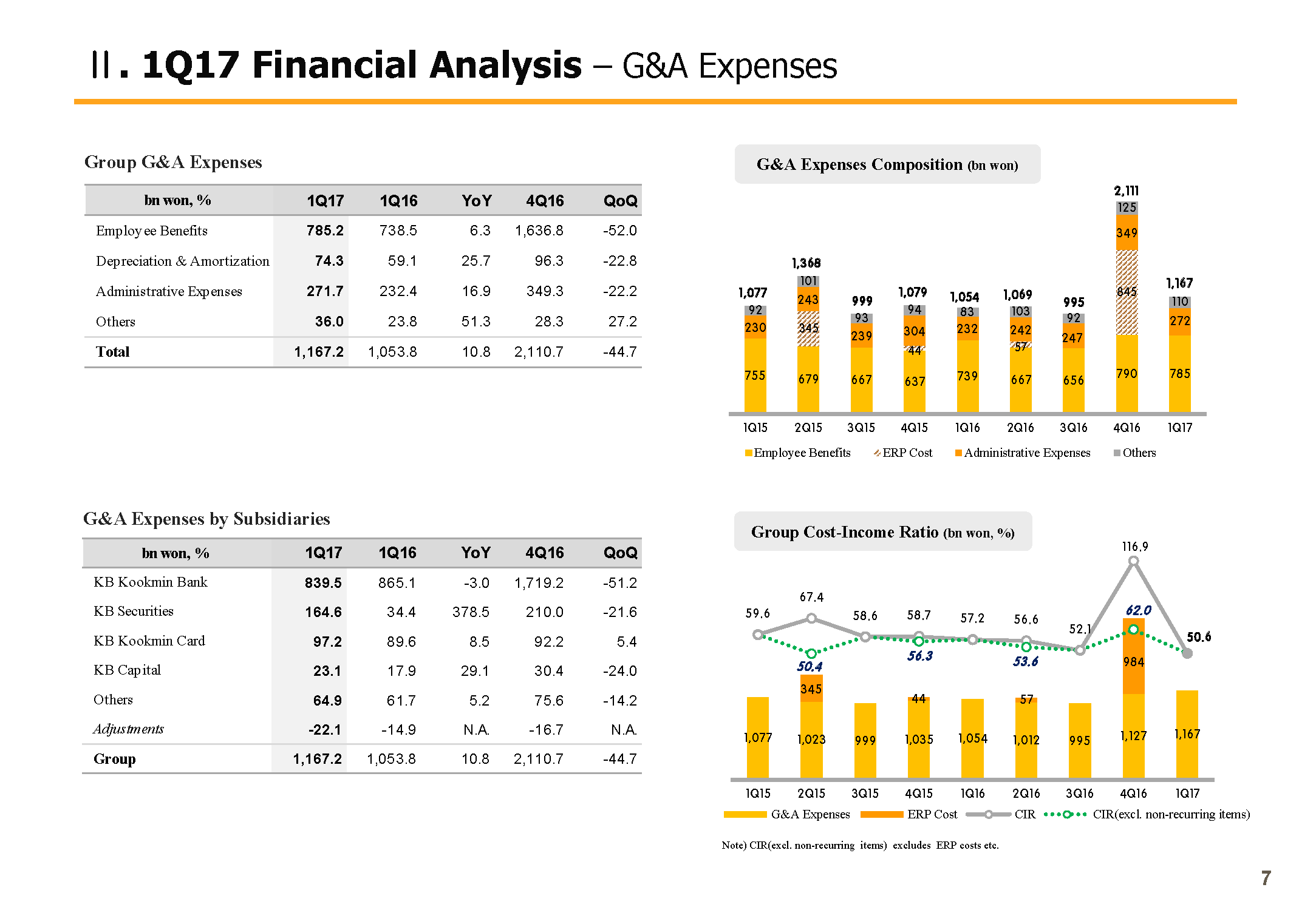 Q1 G&A was KRW 1,167.2 billion, up 10.8% year-over-year due to consolidation effects of Hyundai Securities. But with this factor excluded, there was decline driven by labor cost savings from ERP. Q1 CIR, thanks to even growth in interest and noninterest items, gross operating income recovered above KRW 2 trillion level. And with good control over G&A, cost income ratio came in at 50.6%. Q1 PCL provisioning was KRW 254.9 billion, somewhat of an increase compared to previous year, where there was a sizable reversal from accounting standard changes as well as compared to the previous quarter when there were write-backs for certain companies, which pushed down the PCL level significantly. One factor to note for Q1 is provisioning of mid-KRW 60 billion in relation to DSME.