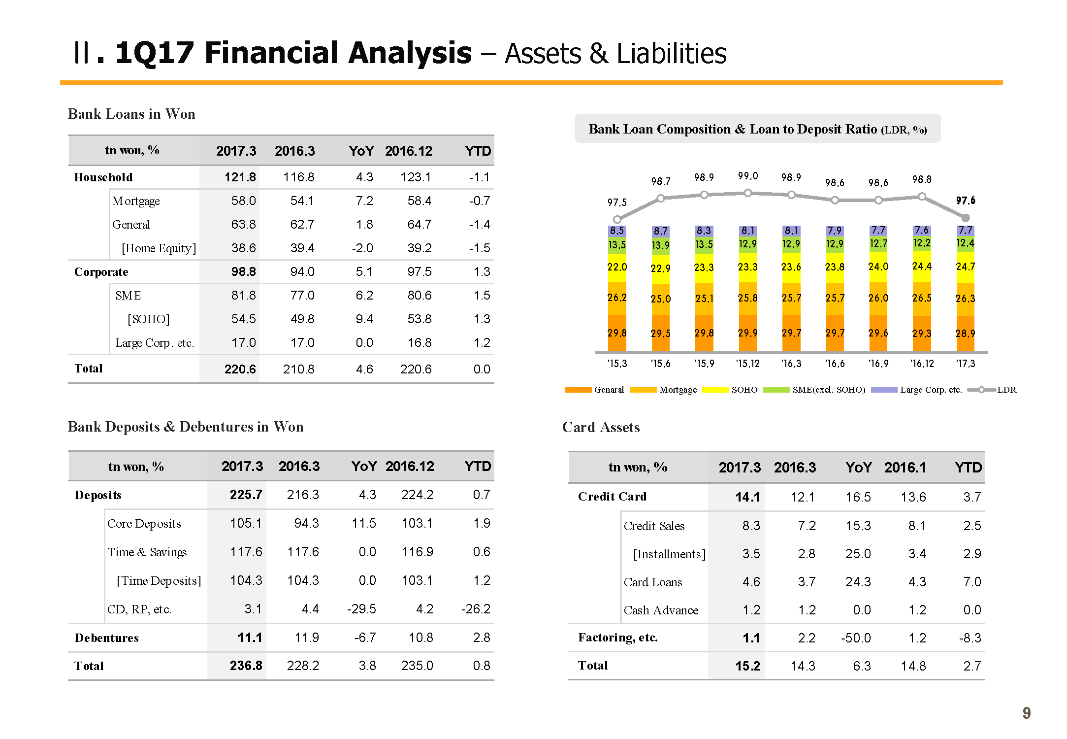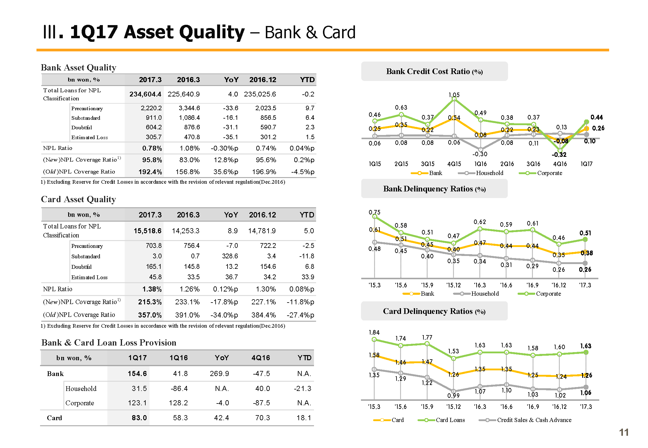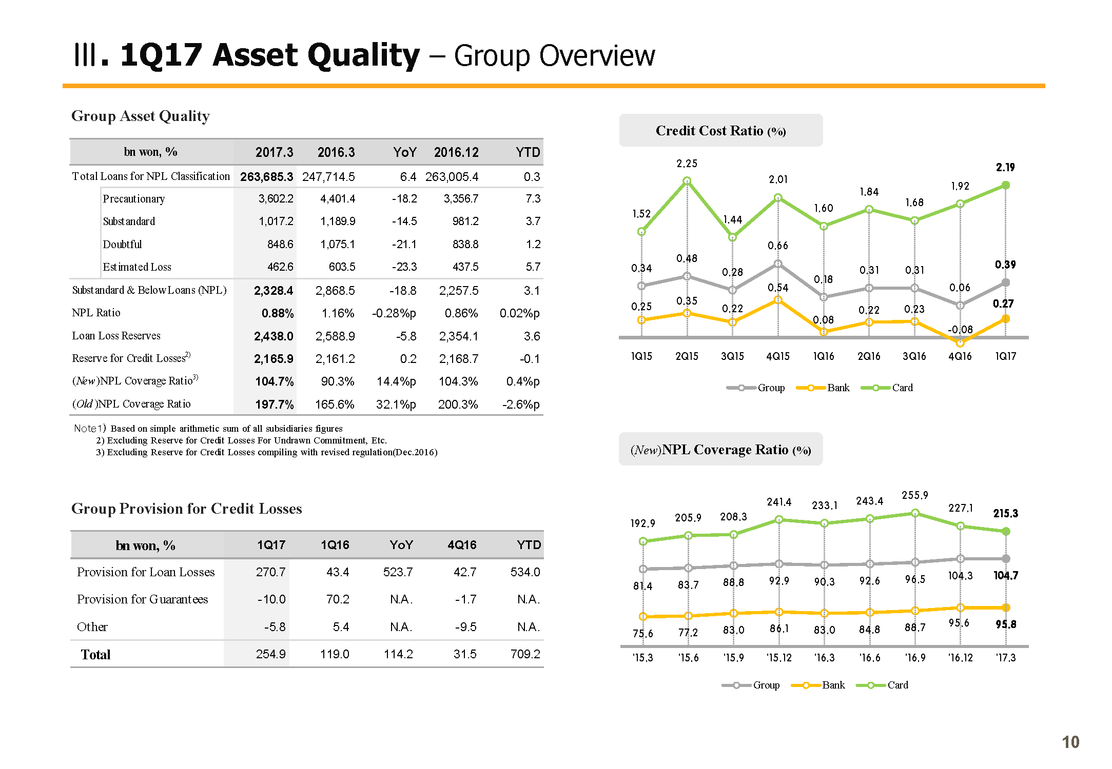 Next, credit cost ratio on the bottom left side. Groups credit cost ratio compared to the group total loans posted 39 bp in Q1 and rose slightly Y-o-Y. But excluding the Daewoo Shipping and Marine Engineering or DSME effect, last year's sound asset quality trend seems to be continuing.