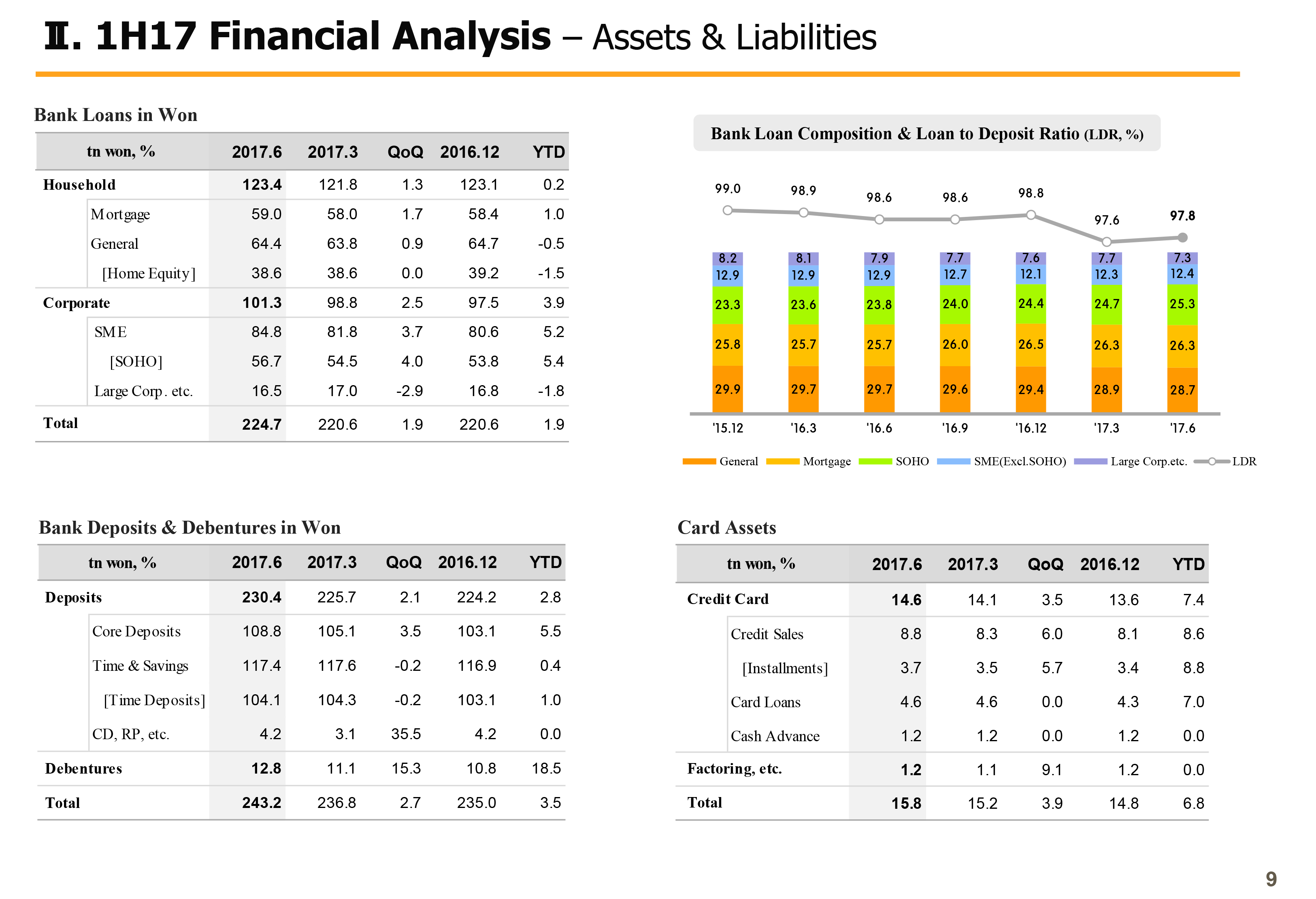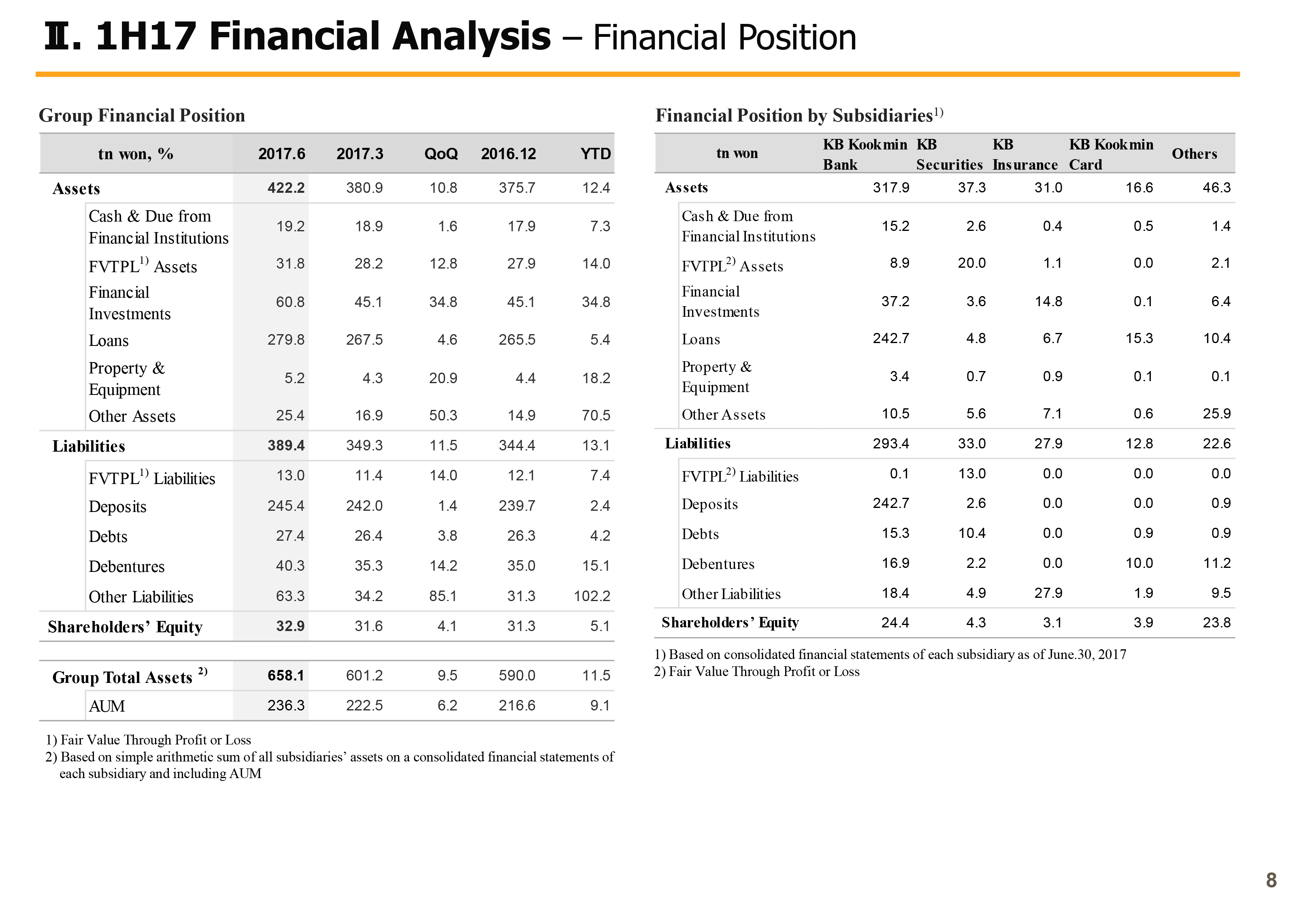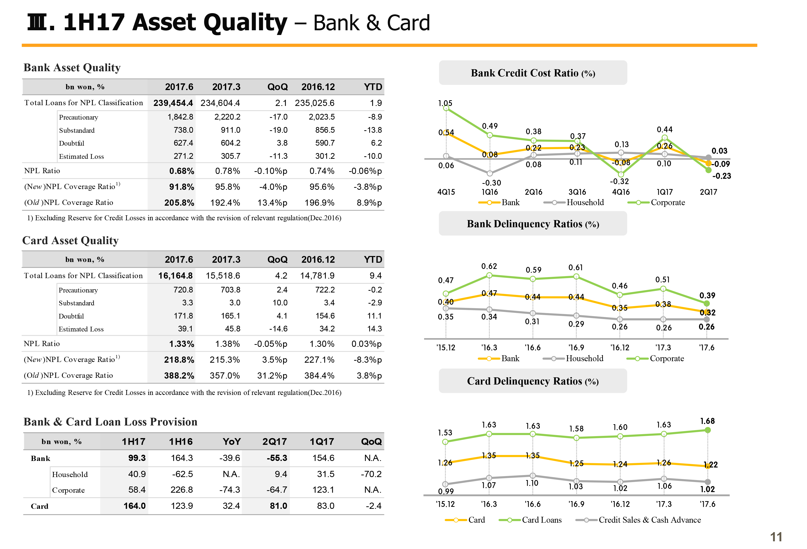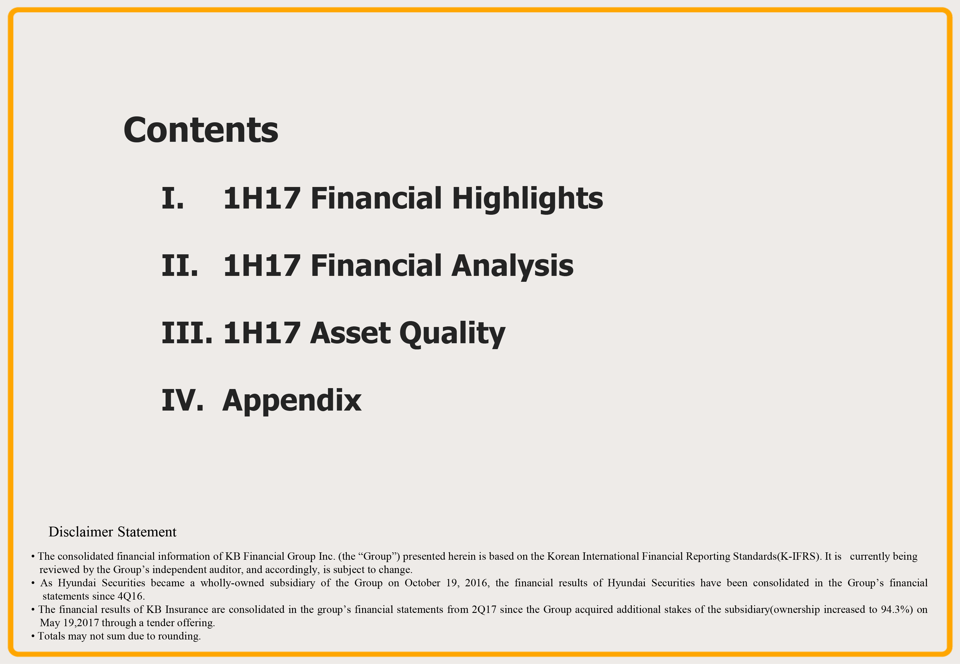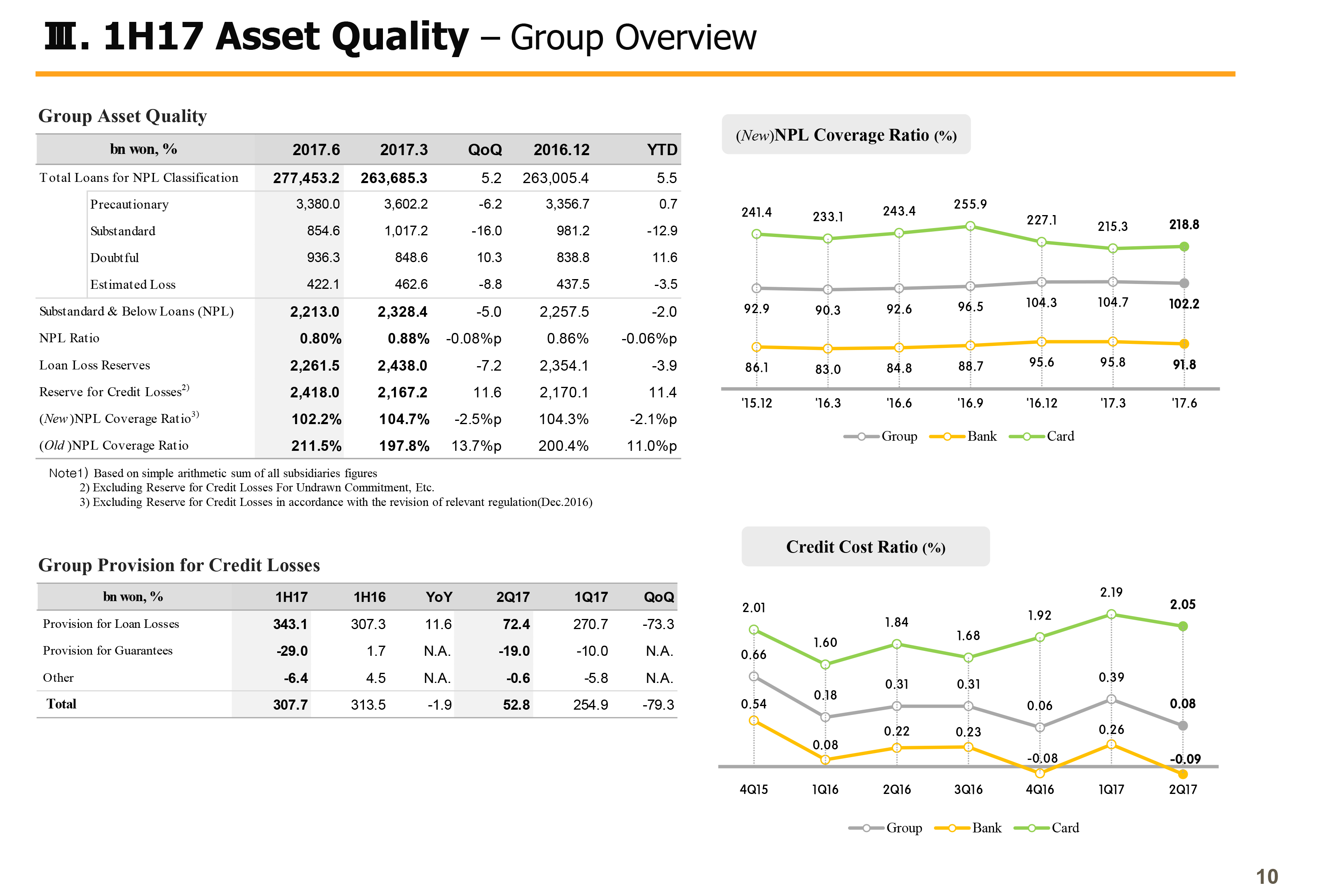 Next on Page 3, I will talk about key financials. 2017 first half ROA and ROE group cumulative were 0.96% and 11.76%, respectively, improving significantly year-over-year. This is due to NIM improvements and falling credit cost leading to sizable improvements in bank profitability and higher nonbanking gains on the back of acquisition of Hyundai Securities and its higher shareholding in KB Insurance.