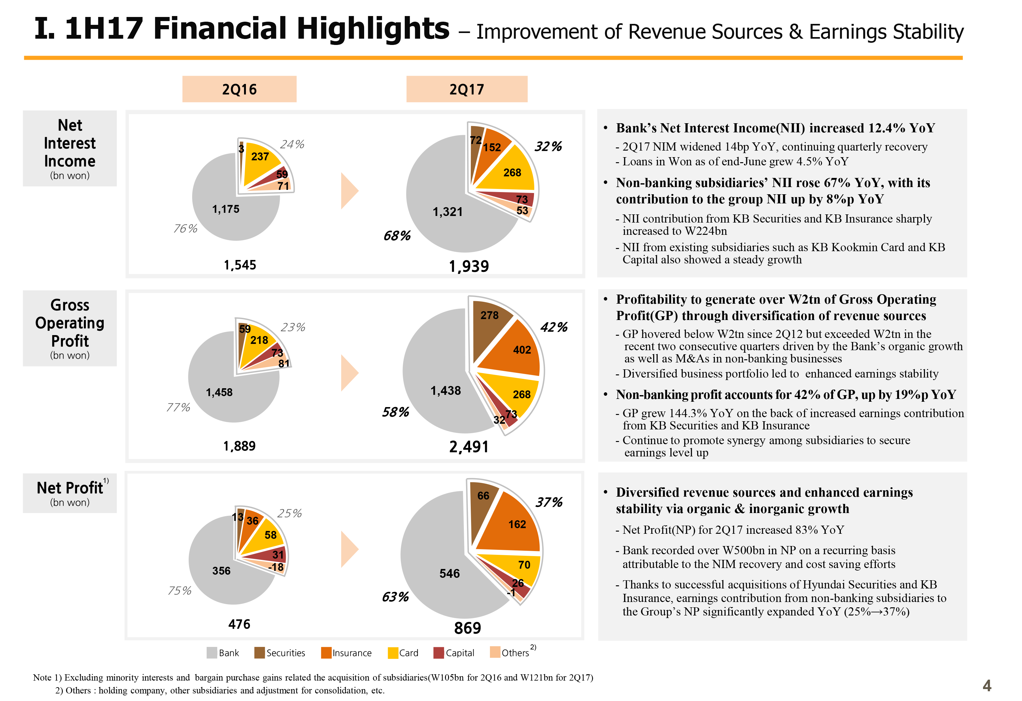 Last item is on the group's net profit. We took out the gain from bargain purchase impact for comparison purposes. The graph shows Q2 2017 net profit of KRW 869 billion, a sizable rise year-over-year from last year's KRW 476 billion. Nonbank's contribution in the mix increased meaningfully from 25% to 37%.