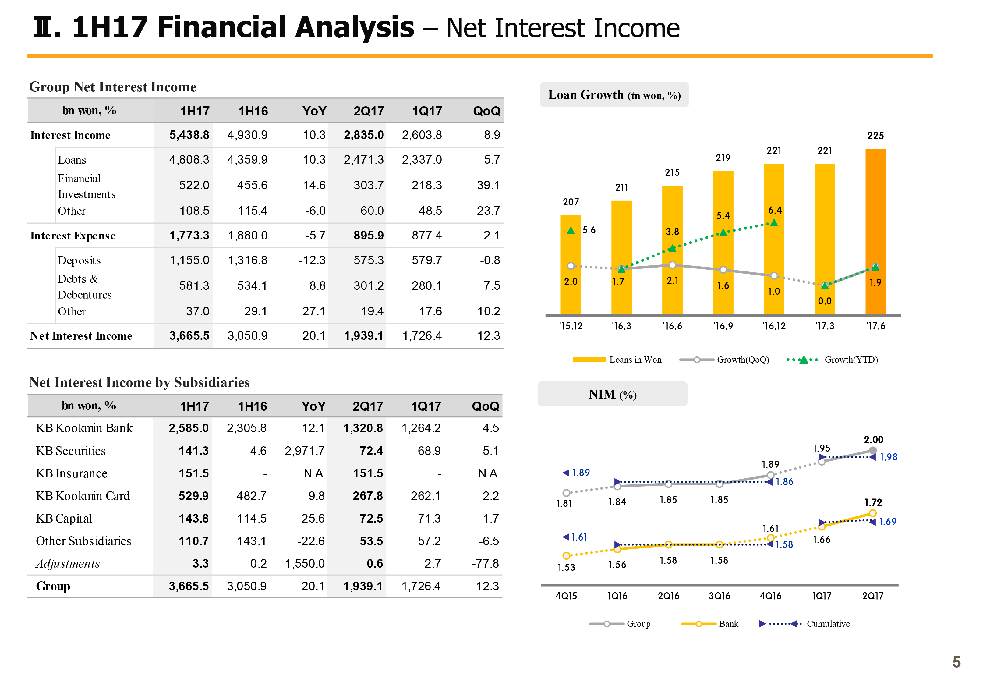 Page 4 compares key metrics across bank and non-bank affiliates and key P&L line items between Q2 of 2016 and Q2 of 2017. It shows our efforts so far to diversify revenue sources and improve stability in profit are bringing visible results. First is on net interest income. Q2 2016 NII was around KRW 1,555 billion and the Group's net interest income in Q2 2017 was around KRW 1,939 billion, rising 26%. This is thanks to sound loan growth and our continuous efforts to enhance NIM, align the banks to regain its core capacity in generating interest income and also from the consolidation effects from securities and P&C insurance affiliates, the steady interest income growth from existing affiliates of KB Card and KB Capital. For your information, bank's NIM over the recent 4 quarters displayed sustained improvement and in a cumulative basis increased a total of 14 basis points.