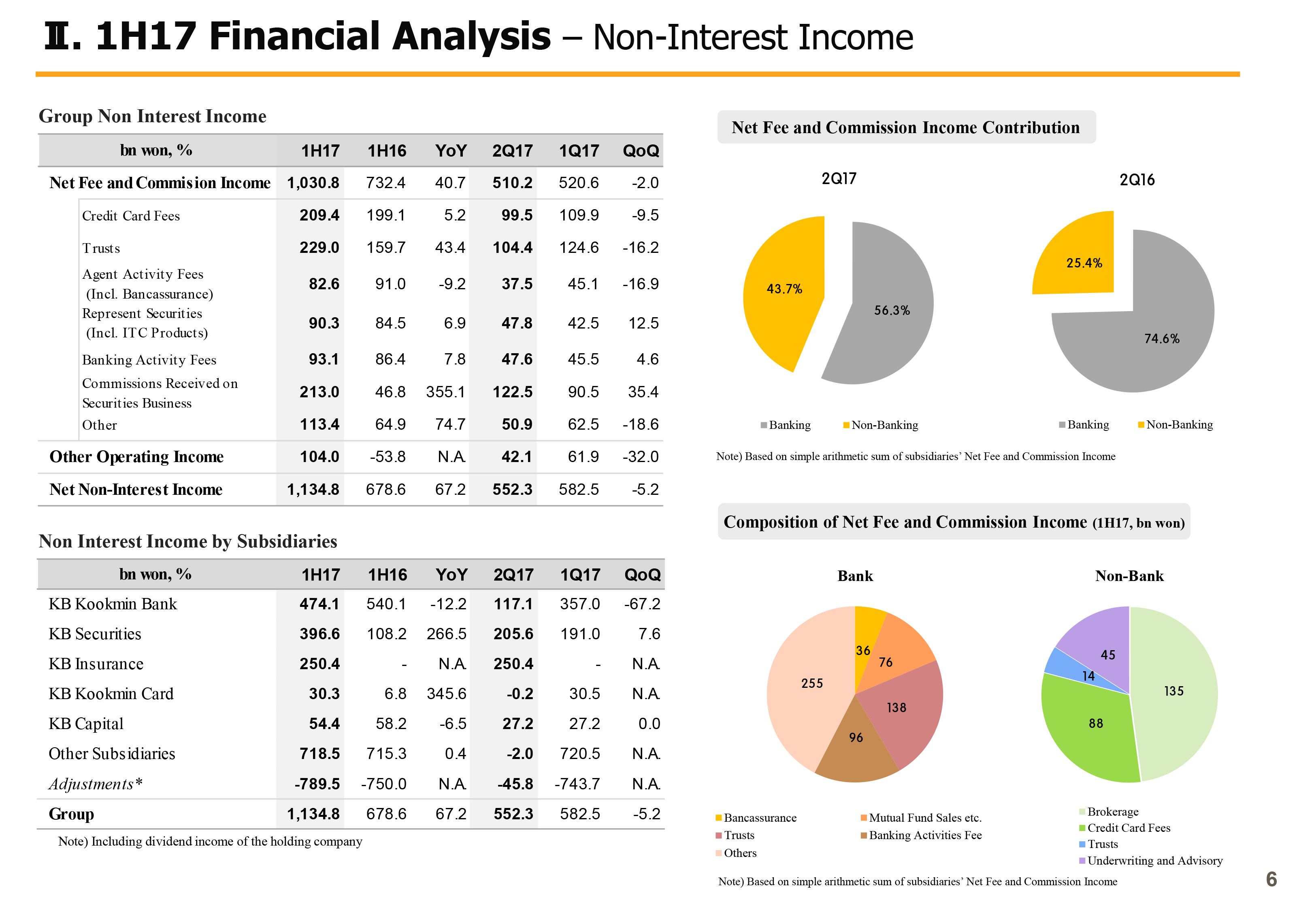 Now let's look at our first half business results. KB Financial Group's 2017 first half net income was KRW 1,860.2 billion, which is the highest half-year performance in the group's history. This is a 65.3% increase year-on-year and this is mainly due to the consolidation of Hyundai Securities and more recently, KB Insurance which has greatly helped boost nonbank income as well as increased bank interest income, driven by improved net interest margin. Net income in Q2 was KRW 990.1 billion, which is a 13.8% increase compared to Q1 which recorded KRW 870.1 billion.