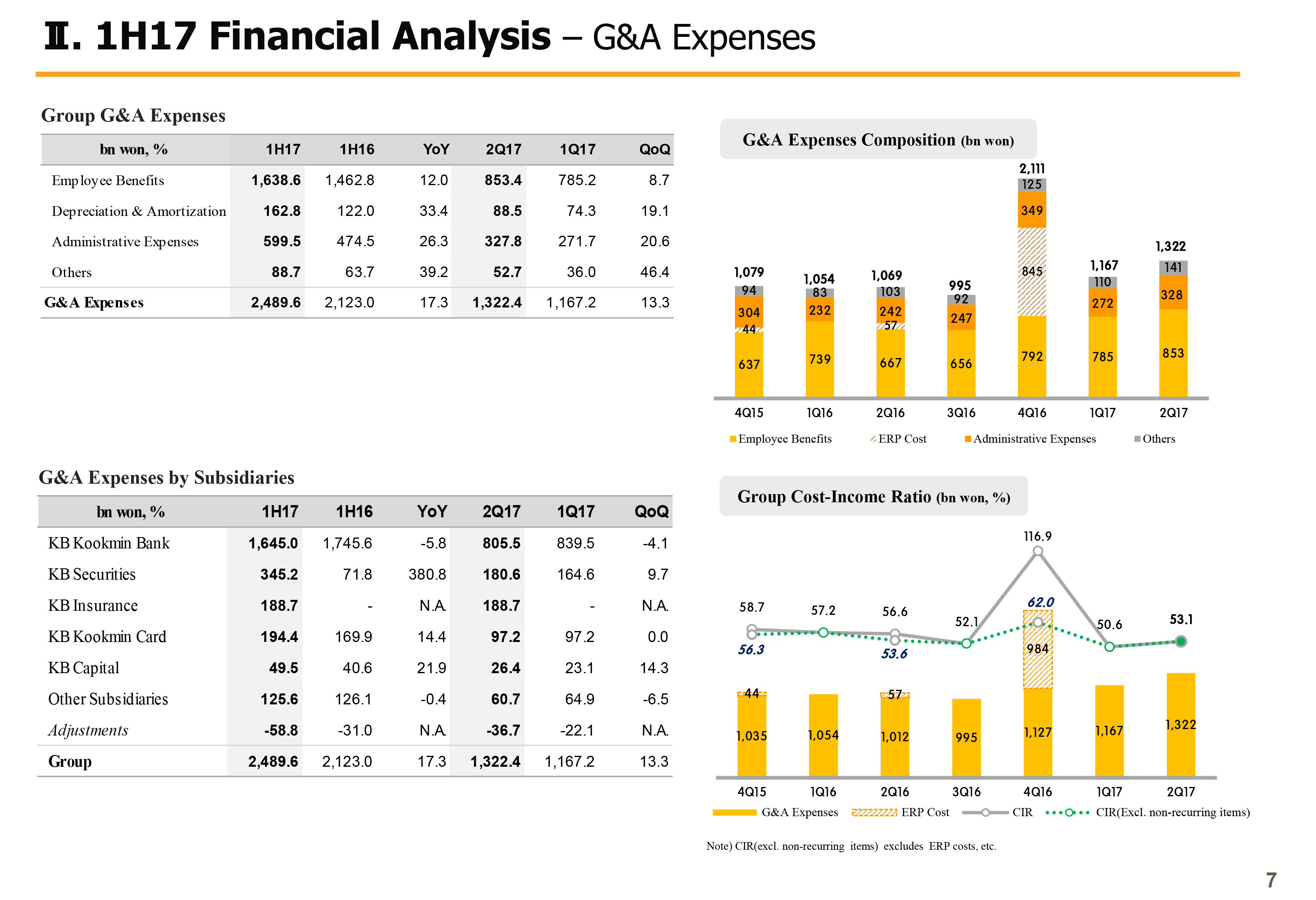 On the top right, you will see the cost income ratio coming in at 53.1% in Q2, slight rise q-on-q. However, this is due to higher G&A, driven by consolidation effect from KB Insurance and losses from securities and derivatives on interest rates and exchange rate rises. Apart from such factors, group recurring basis CIR is maintained at a quite stable level.