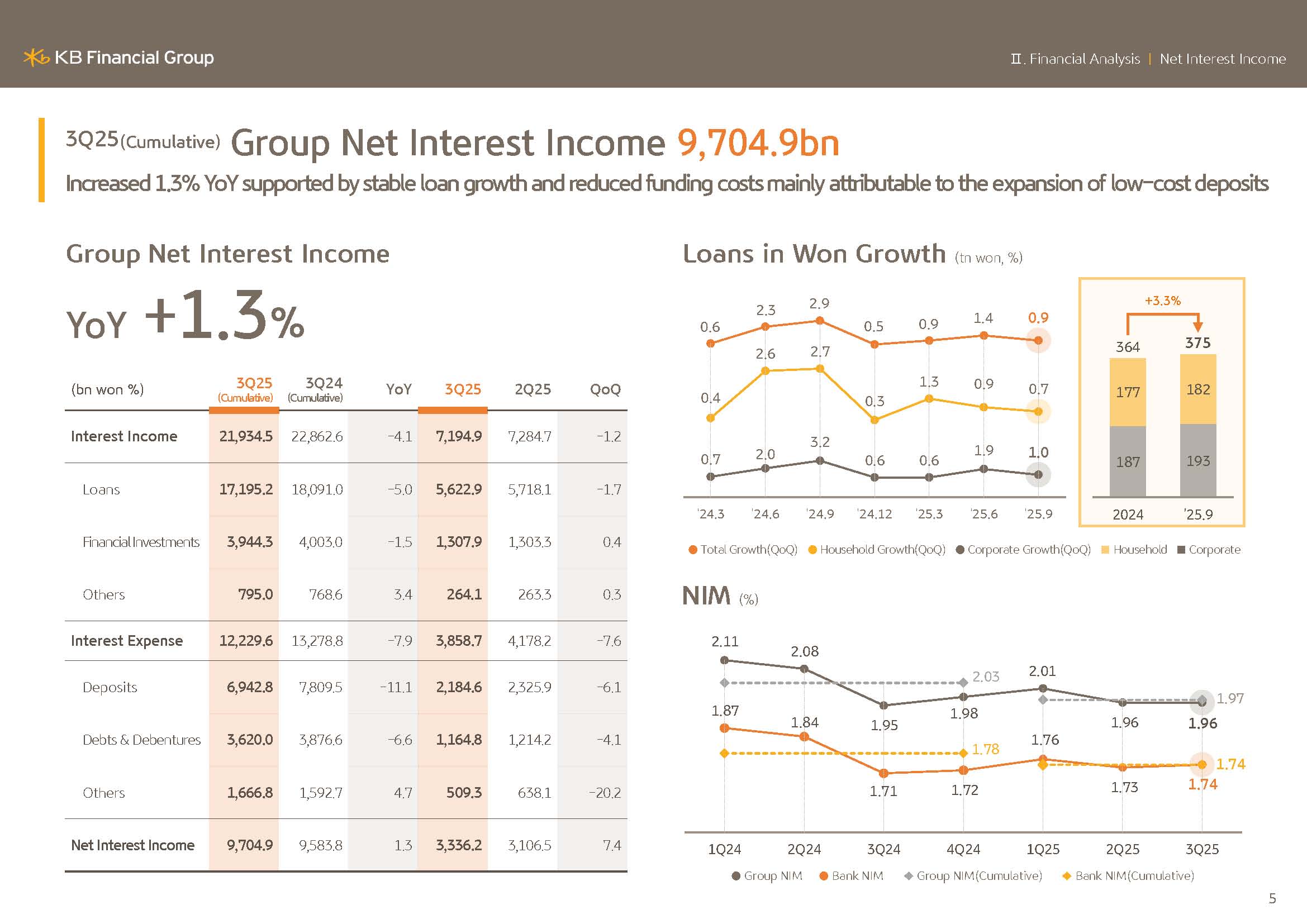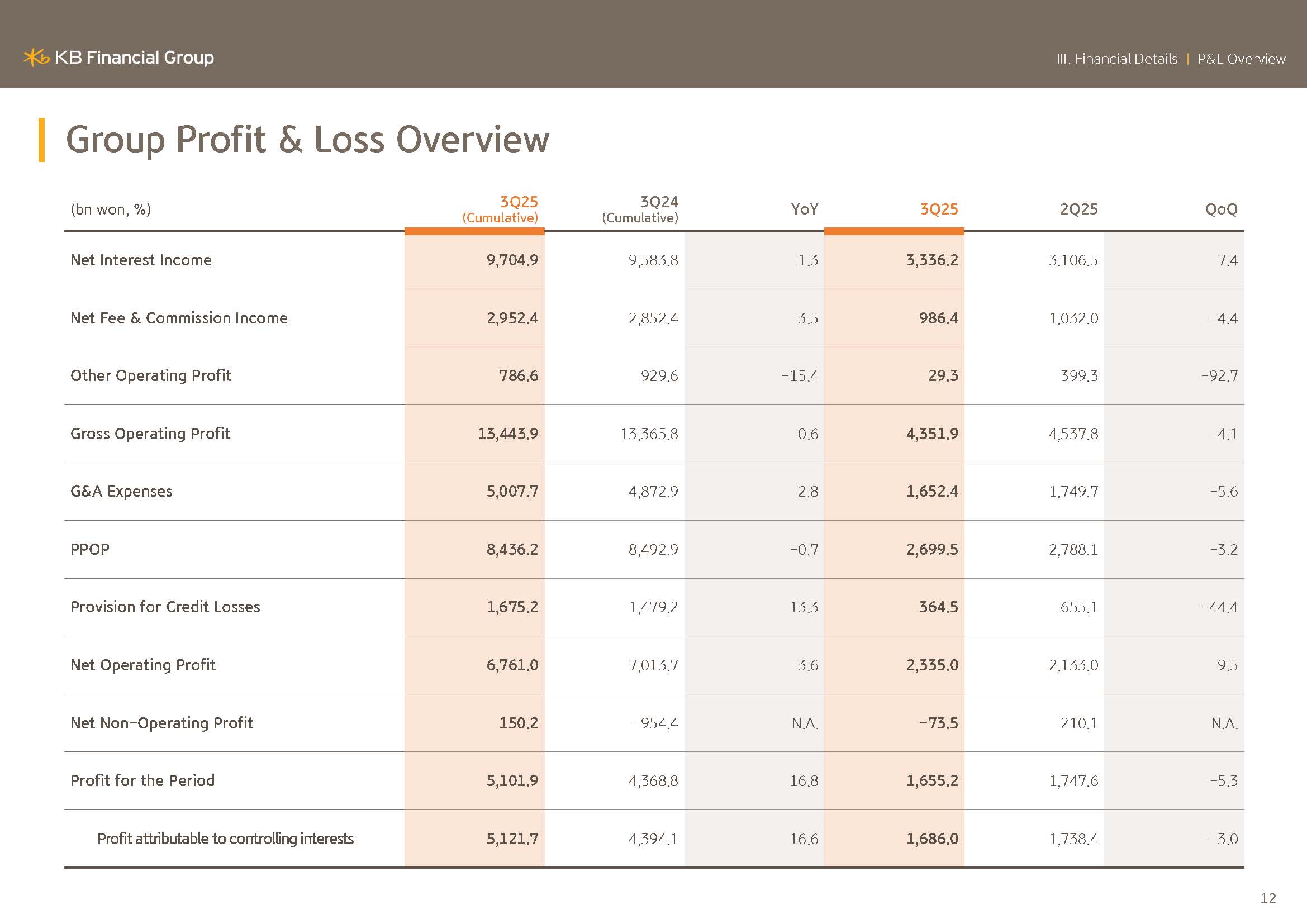 In Q3 '25, group's net interest income was KRW3,336.2 billion, but removing the base effect of costs