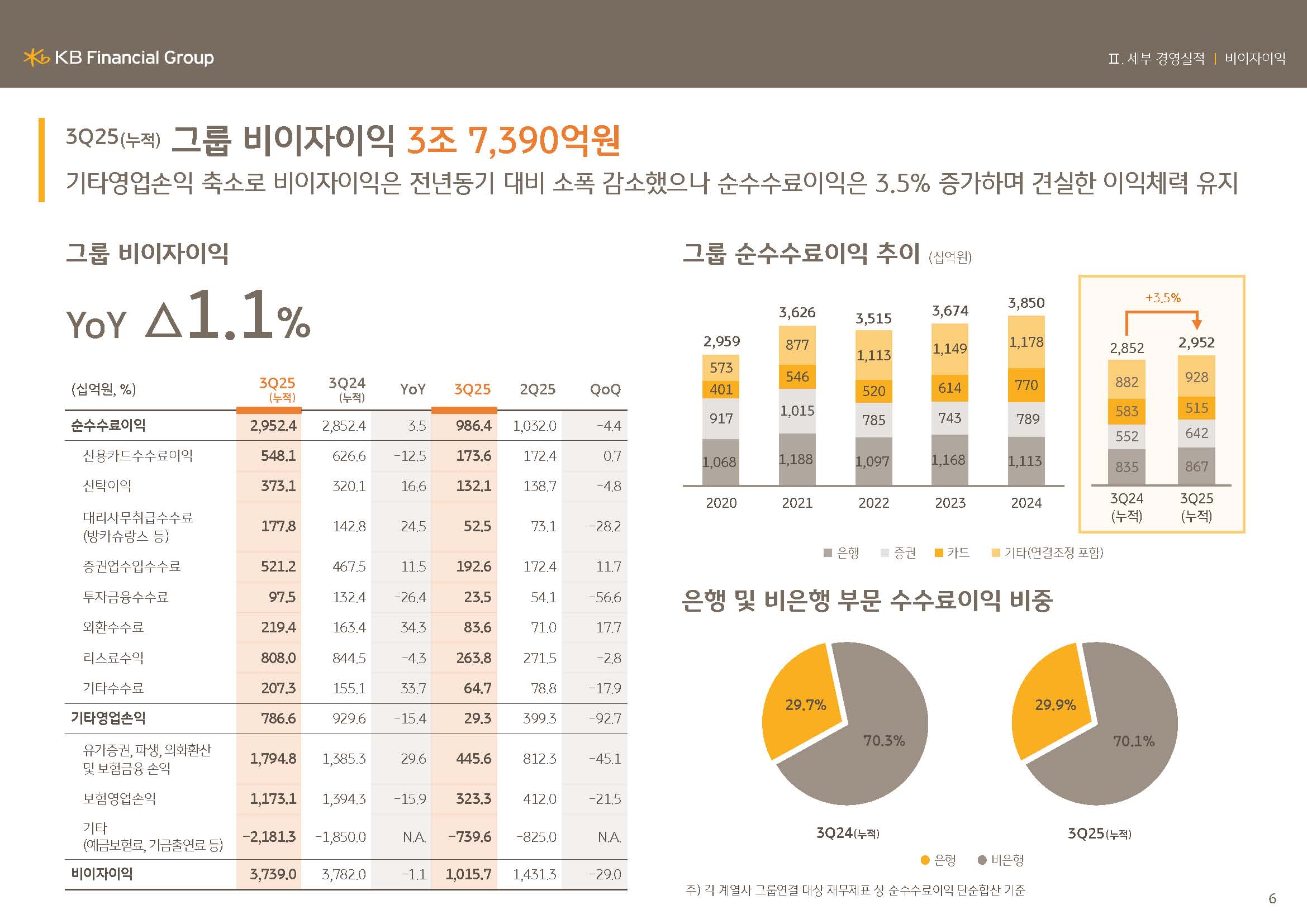 한편, 3분기 누적 순수수료 이익은 2조9,524억원으로 전년동기 대비 3.5% 증가하였습니다.