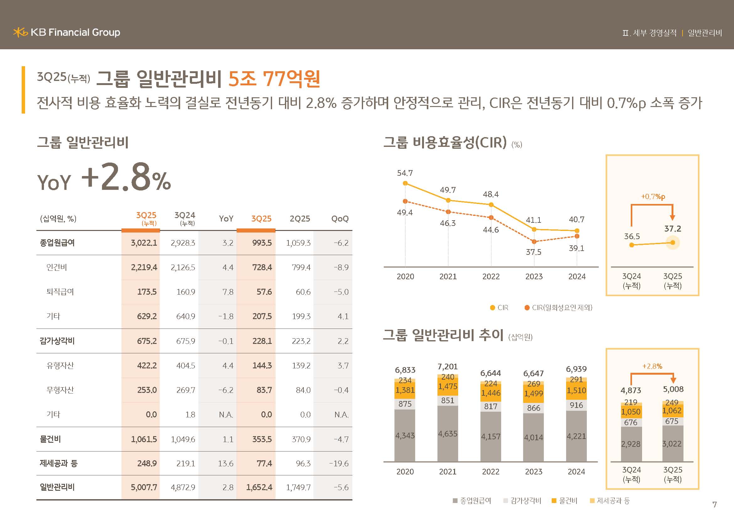 증가하는데 그쳤으며, 3분기 누적 그룹 CIR은 37.2%로 목표 범위 내에서 안정적으로 관리되고 있습니다.